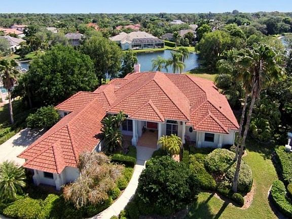 Located in The Oaks Bayside is this lovely 4 bedroom, or 3 and an office, 4 bath home on an incredible cul d' sac lot with gorgeous 180 degree northeastern views over a lake. Built by Tivoli builders this home features a wonderful split floorplan, no steps anywhere, a huge master bedroom and bath, kitchen open to the family room, and all bedrooms on suite. The exterior is adorned with a large screened and covered porch, a large open heated pool overlooking the lake, and a three car side loading garage. Membership in Sarasota's premier country club, The Oaks Club is available and required.