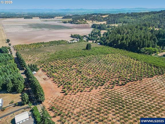 Incredible opportunity to own five tax lots totaling 93.92 acres of prime EFU-zoned land, surrounded by AR5 properties. The majority of the acreage is a beautifully maintained orchard with a history of vineyard contracting. Enjoy sweeping territorial and mountain views, a year-round creek, and a serene pond on the included parcel across the road. The main home has been extensively remodeled over the years, featuring a new roof, ductless mini-split system, and a beautifully landscaped yard. Inside, a welcoming family room with a fireplace and sliding doors opens onto a spacious deck. The kitchen is bright and functional with a skylight and elegant cabinetry. The primary bedroom is conveniently located on the main level, while upstairs offers two additional bedrooms and a versatile bonus space. The basement provides a private office and a large flex room ideal for media, recreation, or hobbies. For equipment, business operations, or hobbies, the property offers two fully serviced shops (34x70 and 32x48), each equipped with power and water for maximum functionality. The second home includes 2 bedrooms, 1 bathroom, a cozy living room with fireplace, kitchen with dining area, and an unfinished basement with laundry hookups—perfect for a future family room, office, or creative space. It also features its own ductless heat system and a 30x30 shed. Water for the rental cabin is shared with the main house. This rare offering combines agricultural income potential with residential versatility. Whether for farming, vineyard operations, or a private retreat, the property’s multiple residences, breathtaking views, and productive land make it truly exceptional. Don’t miss your chance to own this unique and versatile estate!