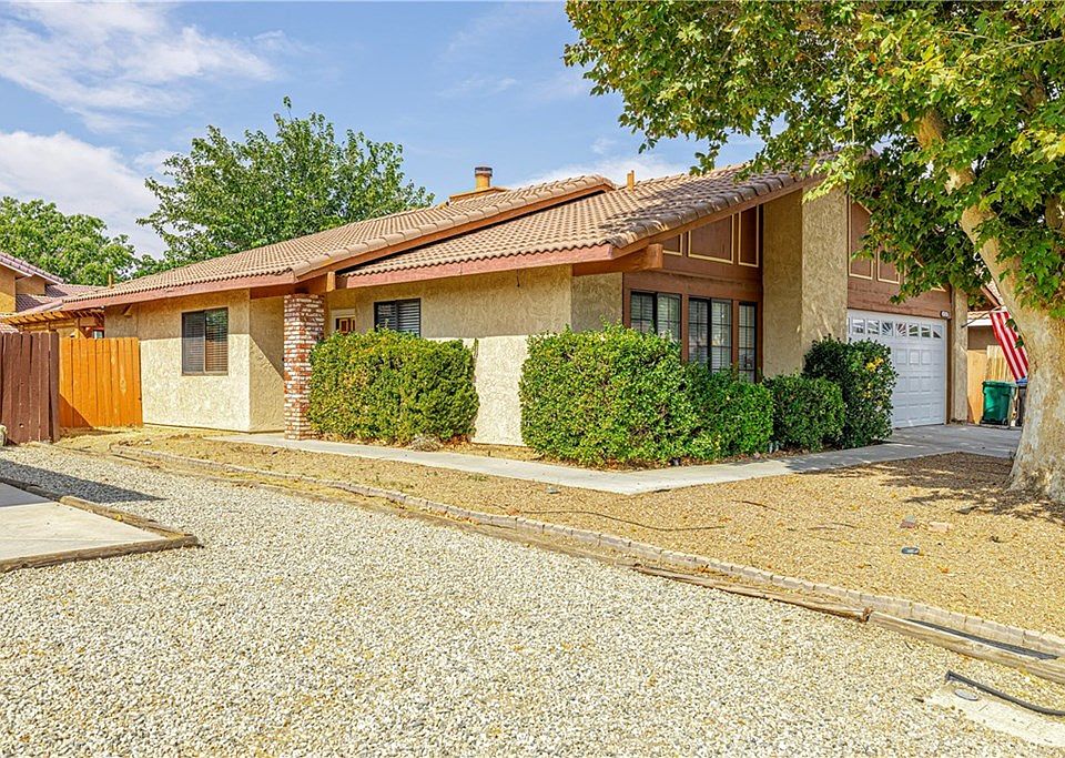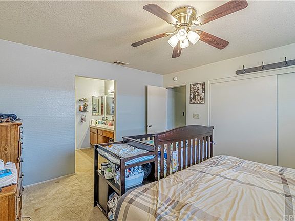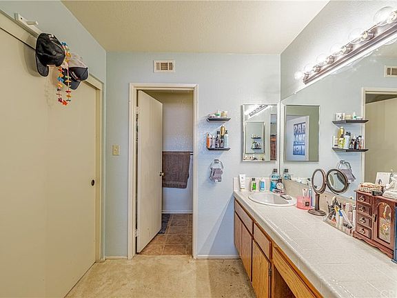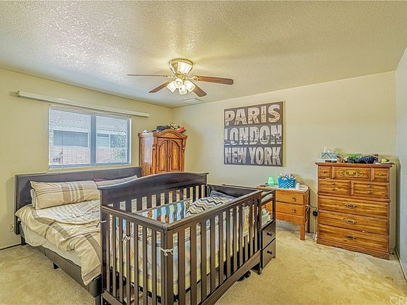 Single story well maintained home. This floor plan includes separate living room and family room with fireplace, formal dining area. Soft pastel two tone interior paints and carpet throughout. The kitchen has tile countertops, stainless sinks, garden bay window, wood plank flooring, cherry wood type cabinets, newer upgraded kitchen appliances microwave and stove. Wood type blinds, Vaulted ceilings, Overhead lighting with fans. Newer AC and Heater units with additional evaporative cooling system. Two full bathrooms. Master bedroom with two full length closet and bathroom has vanity desk.