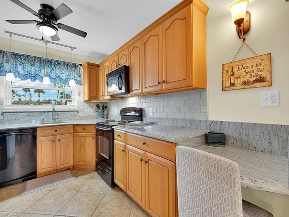 Beautifully upgraded ground floor unit in 55 Plus community. Impact resistant windows and slider. Enjoy the tranquility of your lanai overlooking a landscaped area. Two spacious bedrooms and two bathrooms make this a great size unit. Large walk-in closet in the master with custom shelving. Tile and luxury vinyl flooring throughout, no carpet. Located directly across from the pool and clubhouse this unit has an ideal location. Active community with pool, bocce, pickleball and tennis as well as many community events such as dinners, cards, yoga classes and painting classes. Unit is sold furnished.
