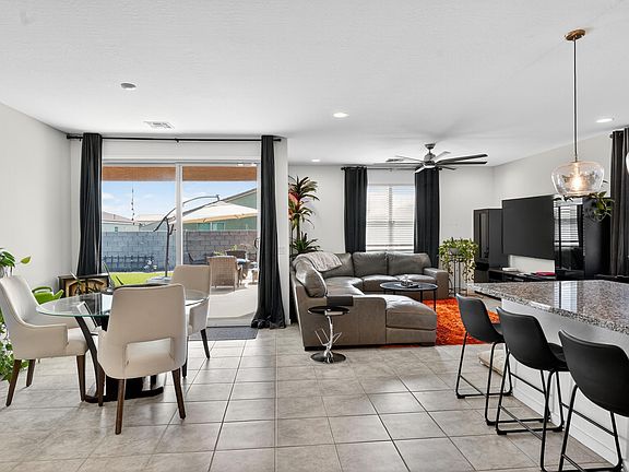Located in the heart of San Tan Valley's gated community, this 4-bed, 3-bath home blends style and comfort. The kitchen boasts granite countertops, stainless steel appliances, and light, bright white cabinetry. Spacious living areas feature durable tile flooring, while bedrooms are finished with plush carpet. The split floor plan includes a private in-suite plus a flex room between two bedrooms. The oversized master retreat offers dual sinks, soaking tub, and walk-in shower. Enjoy a beautiful, low-maintenance backyard with lush green turf, RV garage with extra parking and take advantage of the community pool just steps away.