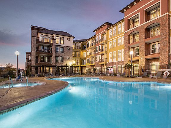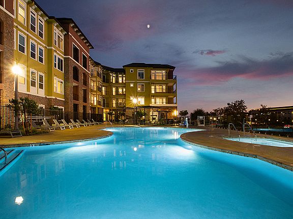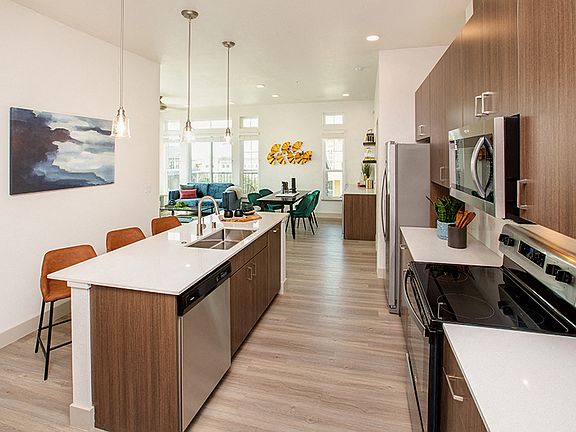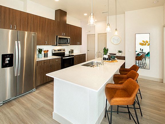 - Exterior features: 24-Hour Emergency Maintenance Service, Balcony, Barbecue, Business Center, Coffee bar, Custom cabinetry with brushed nickel hardware, Game Room, Open-concept floor plans, Oversized closets, Package Receiving, Pet grooming station, Quartz countertops, Spin and yoga studio, Stainless-steel appliances, Theater, Tile backsplash, Wood-style plank flooring