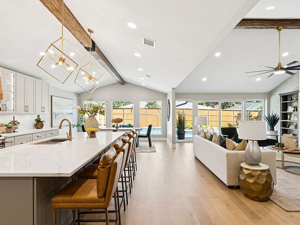 Bosch dishwasherEasy-maintenance vinyl linerEnglish oak flooringLarge eat-in dining areaHuge patio areasQuartz counters and backsplashCustom closets