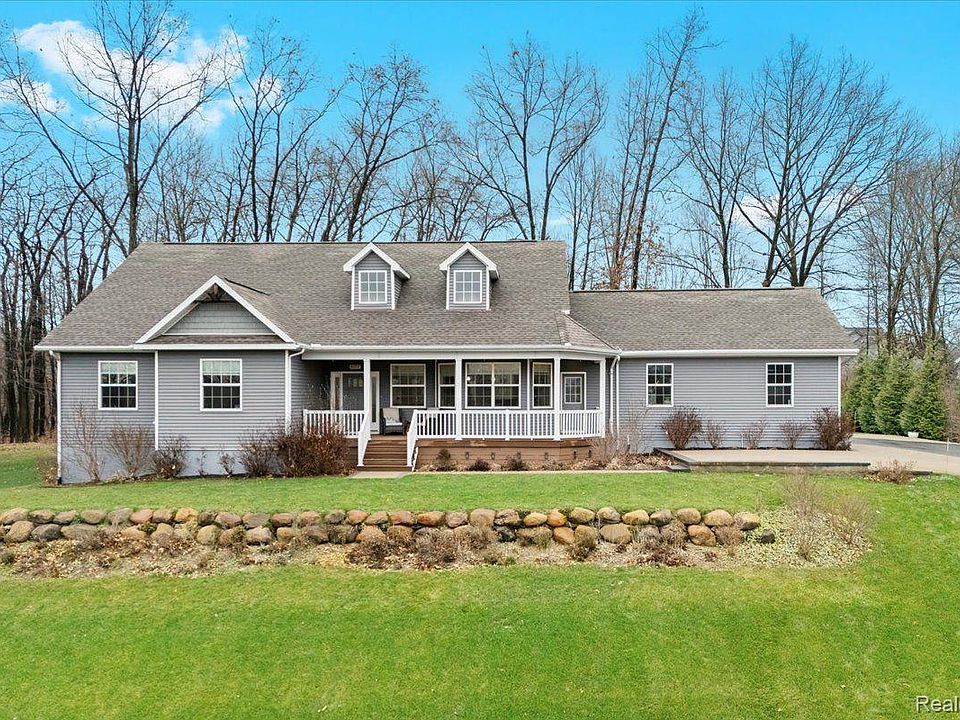 Welcome to this stunning home in Howell, nestled on over an acre of land and ideally located near M-59. This 4 bedroom, 3 bathroom residence boasts a bright and airy open-concept design, starting in the living room which features a gas fireplace. Just beyond, the dining area and kitchen provide seamless access to the covered back porch, where you can relax and take in the privacy of your expansive backyard. The kitchen is a chef’s dream, featuring sleek cabinetry, quartz countertops, stainless steel appliances, a spacious pantry, and a dedicated seating area. The generously sized primary suite is bathed in natural light and offers a private ensuite with dual sinks, a luxurious soaking tub, a beautifully tiled shower, and a large walk-in closet. Two additional spacious bedrooms, a full bathroom, and a convenient laundry room complete the main level. Downstairs, the finished basement is perfect for entertaining, complete with a built-in bar and a 4th bedroom with direct access to the 3rd full bathroom. A 2-car attached garage, water oxidizer and a newer furnace add to the home’s convenience and comfort. Don’t miss your chance to make this incredible property yours!