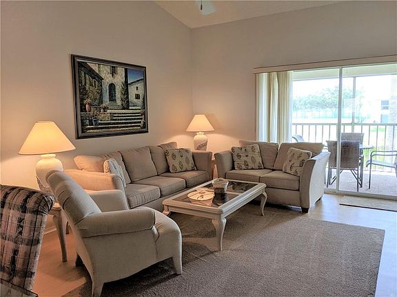 AVAILABLEL FOR 2026 SEASON! CENTER GATE AREA CONDO! Second floor 2/2 condo overlooking a pond with a screened lanai. Vaulted ceiling give this condo a bright spacious feeling. Eat in Kitchen and a dinning room, washer and dryer included. Walking distance to the pool, tennis, shuffle board and clubhouse with fitness room. This is not available annually. THREE MONTH MINIMUM. Off season will pay electric and water. Season rate is $3200, cleaning fee is $300, and 13% sales tax.