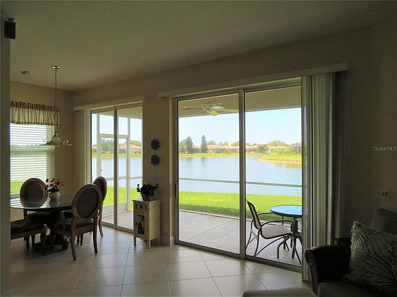 Stunning, Panoramic Lake Views! Turnkey furnished, move-in ready, Maintenance Free, 2 bedroom and den, 2 bath paired Villa with open great room design. Recently Updated 2018 with new porcelain tile throughout; gorgeous new kitchen with sleek contemporary cabinetry and hardware, granite countertops and designer tile backsplash, stainless steel appliance package with gas range, Bianco sink and fixtures and spacious closet pantry; Totally updated master and guest baths with new cabinetry, granite, Toto toilets, fixtures, lighting; and new top of the line LG washer/dryer in the spacious utility room. Other features include: New gas hot water heater 2021; A/C 2014 and Hurricane Impact windows and metal shutters 2013. You will also enjoy the freshly painted interior, inviting Florida style decor and abundance of storage in your attached 2 car garage. Spacious screened lanai with room for expansion. Lakeridge Falls active lifestyle 55+ community offers first class amenities with low fees: gorgeous clubhouse with full kitchen, heated pool and spa, fitness center, meeting rooms, social outside gathering areas, bocce ball courts, billiards, guard gate and on-site manager. This secure, gated community offers an abundance of lakes; miles of internal sidewalks; impeccable landscape and lush grounds with easy walkable access to University Walk Shopping center with a large selection of shoppes, restaurants, Publix, Walmart, Gas, bank, etc. Located in the heart of the University Pkwy shopping corridor; 5 minutes to the UTC mall; 15 minutes to downtown Sarasota and the cultural arts district; and 20 minutes to St Armands Circle and Lido Beach. Perfect winter retreat or year round home.