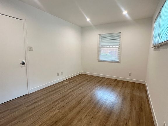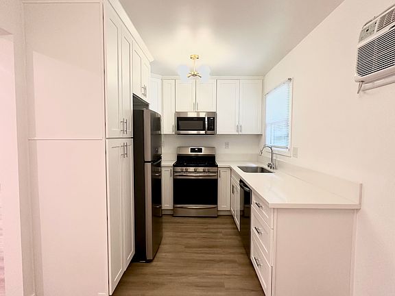 This beautifully updated 1-bedroom, 1-bath duplex offers a modern and comfortable living space. The kitchen features sleek white cabinetry, stainless steel appliances, and plenty of counter space for cooking and entertaining. The bathroom showcases contemporary finishes, a glass-enclosed shower with dark tile accents, and a clean, minimalist vanity. The bedroom includes ample closet space with built-in shelving and drawers, while the warm wood-style flooring throughout adds a cozy yet refined touch. Bright, airy, and thoughtfully designed, this home is perfect for stylish and convenient living.