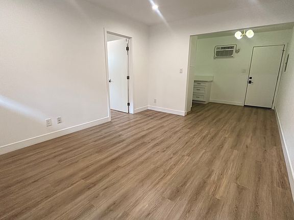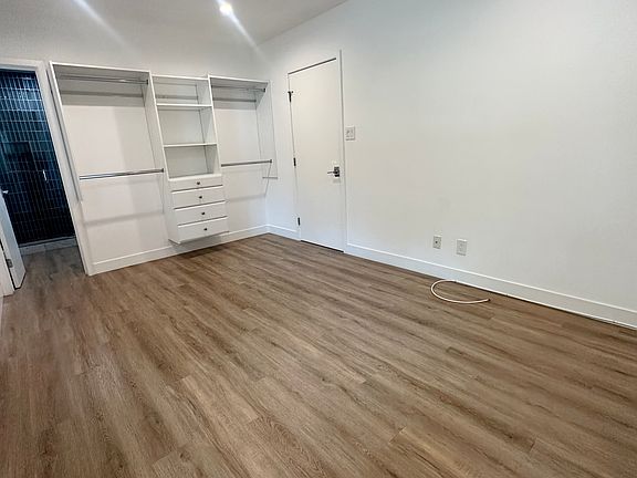 Contemporary finishesWarm wood-style flooringSleek white cabinetryStainless steel appliancesBuilt-in shelving and drawersGlass-enclosed showerAmple closet space
