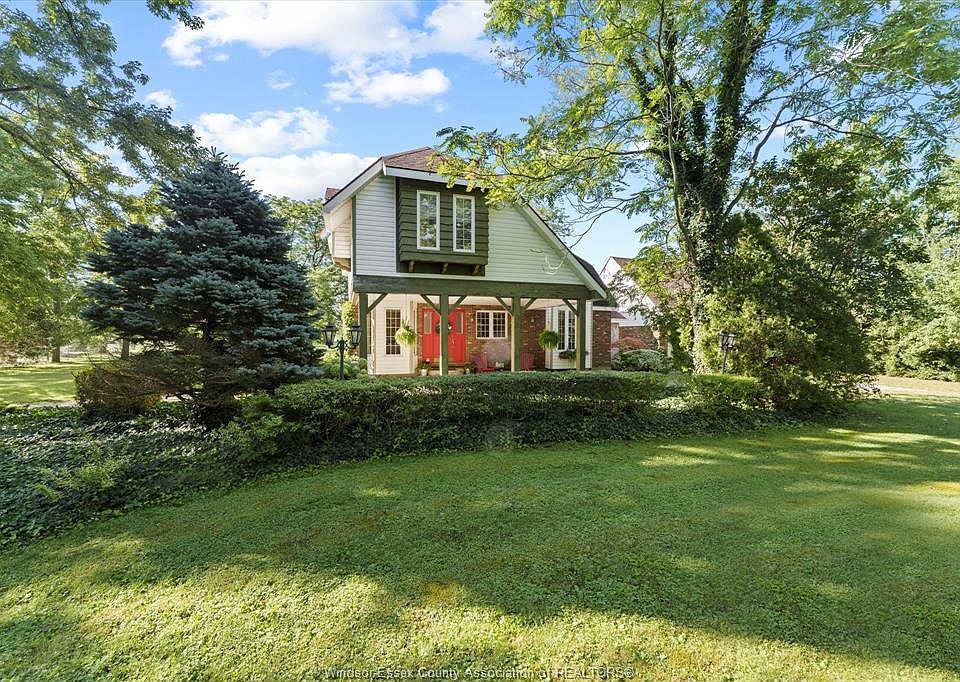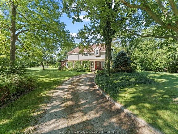 Welcome to 438 County Road 8, a beautifully updated custom home offering approx. 2,800 sq ft of well-designed living space, an oversized 2 car detached garage all nestled on a private 1.3-acre lot full of mature trees and wildlife just down the road from Belleview Golf Course. With 5 bedrooms, 2.5 bathrooms and a grade entrance to the basement this home is perfect for growing families, possibility of multi-generational living by making a basement suite, or anyone looking to enjoy the charm of country living with room to breathe. Step into a stunning living space featuring soaring vaulted ceilings, a floor-to-ceiling brick fireplace, and warm hardwood flooring. Natural light pours through the oversized windows, highlighting custom built-ins and timeless architectural details that make this space both inviting and refined. The heart of the home is a modern country kitchen boasting white shaker cabinetry, quartz countertops, a large center island with seating, and an eye-catching brick accent wall. Open shelving and contemporary lighting blend perfectly with the rustic elements, while the adjacent dining space easily seats 8+ for effortless entertaining. With 5 generously sized bedrooms plus a dedicated main floor office and 2.5 well-appointed bathrooms, there’s space for everyone to spread out and feel at home. Each room offers unique character and comfort. Located just a short drive to Windsor, Essex, and Kingsville, this home offers the tranquility of country living with convenient access to amenities, schools, HWY #401 and HWY #3. Updates include: Rear Addition (approx. 2013), Septic System Weeping Bed Expanded (approx. 2013).