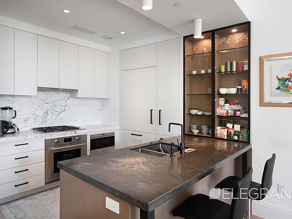 Designed by Paris Forino, every detail has been thoughtfully curatedfrom the floor-to-ceiling bronze-framed casement windows and soaring 10'7" ceilings to the wide-plank European white oak floors and elegant brass accents. The open kitchen is both beautiful and functional, featuring custom Italian cabinetry, Calacatta marble countertops, and top-of-the-line appliances by Wolf, Bosch, and Sub-Zero.