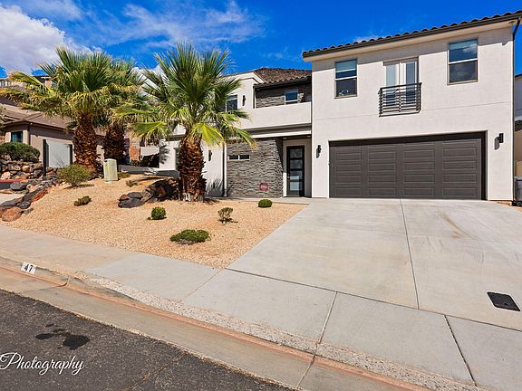 Gorgeous modern home with stunning views of Red Cliffs and the Valley from the deck. Beautiful kitchen features custom cabinets, large island, stainless appliances, and a spacious pantry. Open floor plan highlights an elegant staircase with custom handrailing. Main level offers a den/bedroom and three-quarter bath. Upstairs boasts a quaint landing, wide hallways, and spacious bedrooms. The primary suite impresses with dual sinks, separate tub and shower, and a large closet. Upgraded fixtures and tasteful décor throughout. Inviting backyard with covered patio. Advanced heating/cooling with three thermostats for comfort. Across from park and pond, near schools, medical, shopping, and Sand Hollow Aquatic Center.