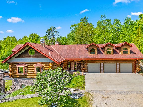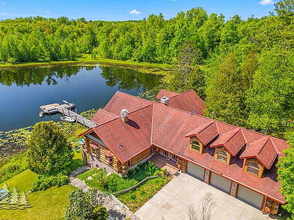 Perched high above a spring-fed private lake, this extraordinary 5,337 sq ft full-log home rests on 114 secluded acres embraced by hundreds of acres of state land. Crafted from massive 24-30'' hand-peeled Scandinavian Norway pine logs and hand-hewn beams, it exudes rustic sophistication and enduring strength. Granite boulders from local quarries anchor the design, while marble, glass, and Vermont soapstone countertops add elegance and warmth. An attached three-car full-log garage complements the residence. More than a home, this remarkable retreat offers unmatched privacy, breathtaking scenery, and timeless Up North tranquility a sanctuary where natural beauty and artisan craftsmanship meet in perfect harmony.