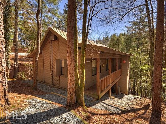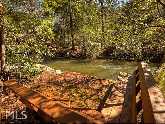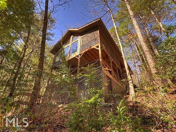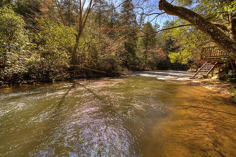 Great River Frontage on the Cartecay River! Well maintained cabin with WOW living room w/great wall of windows overlooking the river; feels like a treehouse on the river. Cabin has good living space w/4 sleeping areas & 2 full baths (walk-in showers). All wood interior, wood burning stove. Lower level w/private sleeping quarters. Hear the river rapids from the main level screened porch & lower porches. Steps w/landing deck lead to another deck & firepit on the river. For those that know the area, cabin is across from the "Island" so the seasonal river traffic passes on the other side keeping river traffic away from this property. (New central HVAC in 2016) Located in Canoe House community less than 5 mi. from Ellijay w/gated security, county water & low HOA.