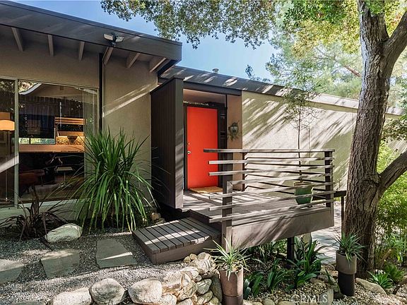 Tucked at the end of a quiet cul-de-sac, the home rests on an expansive lot with meandering stone paths and a botanical garden-like setting filled with native and drought tolerant plantings, and mature fruit trees, including citrus and persimmon. The tiered, multilevel gardens are seasonally enlivened with colorful blooms and fragrant flowers in spring through mid-summer. Expansive walls of glass bring the outdoors in, flooding the interiors with natural light and framing lush greenery and valley views.