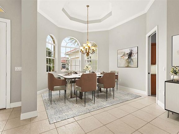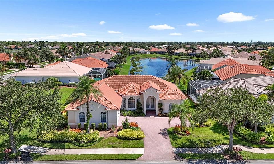 One or more photo(s) has been virtually staged. Mediterranean charm positioned on a serene lakefront homesite, this 3bedroom, 2 and a half bath pool home offers refined living in the gated community of Venetia. Step inside to soaring ceilings, crown details, and sunlit spaces that transition effortlessly from formal entertaining areas to relaxed gathering rooms. The kitchen is designed for both style and function, featuring an island cooktop, built-in oven, generous cabinetry, and a breakfast bar that opens to the family room. The primary suite is a private retreat with tranquil water views, lanai access, two walk-in closets, and a spacious bath with dual vanities, soaking tub, and walk-in shower. A thoughtful split floor plan provides two additional bedrooms and bath, ensuring comfort and privacy for guests. Indoor and outdoor living merge seamlessly as multiple rooms open to the screened lanai. Here, a sparkling pool with spa, and expansive patio overlook the lake, creating an ideal setting for quiet mornings or entertaining at sunset. Residents of Venetia enjoy resort-style amenities including a clubhouse, fitness center, tennis and pickleball courts, bocce, shuffleboard, basketball, and a community pool and spa—all with low HOA fees and no CDD fees. Located just minutes from the pristine Gulf beaches, downtown historic Venice Island, Wellen Park, Atlanta Braves Spring Training Stadium, shopping, and dining, this property offers both a home and a lifestyle.