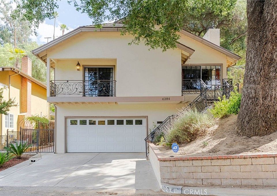 Inside, you'll find a thoughtfully designed layout with three full bathrooms, including a contemporary freestanding tub in the primary suite that creates a spa-like retreat. The suite also features a private balcony overlooking lush trees and surrounding hills, offering a peaceful place to begin or end the day. The kitchen and bathrooms have been updated with modern finishes, including granite countertops and a center island, while recessed lighting throughout the home adds a sleek touch. Open living and dining areas flow seamlessly for everyday living and entertaining. Large windows fill the home with natural light, while smart-home features including a smart lock, Ring doorbell and floodlight cameras, Nest thermostat, and built-in speakers inside and in the backyard add convenience. A Tesla charger in the garage provides additional ease.