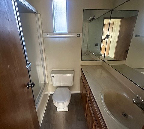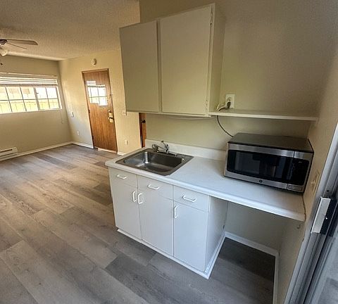 Studio with a walk-in closet, ceiling fan, brand new LVP flooring, private fenced in back porch, and off-street parking at the back of the building.