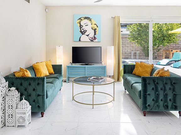 AVAIL NOW- FULLY FURNISHED. Mid-Century gated retreat home in the South End Palm Springs available as a 30 DAY MINIMUM RENTAL. Property is fully fenced with electric gate and plenty of room for off-street parking. This light & bright open concept floorplan offers beautiful tile flooring throughout & an updated kitchen with quartz countertops and aqua subway tile backsplash for that tastefully added ''Pop of Color''. Enjoy your very own oversized pool w/ Southern exposure & views of the western mountains. The Backyard boasts a gas fire pit as well avocado, guava & citrus trees. On the West side of this home is the 4th bedroom with it's own private access to the backyard. Solar system & Tesla EV Charger in place. Whether you are transferring to the area for work or looking for a vacation rental, this home is an amazing opportunity! 30-Day Minimum Stay Required. Pets Allowed with owner approval