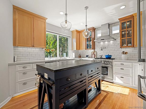 Welcome to your dream property on the top of the hill in Point Loma. Enter the 7,000 sf yard to a newly landscaped space with a view deck area that invites you to sit and enjoy the view to downtown. Offering an ideal floorplan, this home checks all boxes. Downstairs you will find the main living areas (beautifully remodeled gourmet kitchen, formal living room, formal dining room with wine refrigerator, family room with a cozy fireplace plus a bedroom and guest powder), upstairs you will find 3 bedrooms, 2 bathrooms and laundry. Once inside, you will notice the attention to detail throughout. Rooms flow from one into another on the ground level. Step into the dream kitchen with a Soapstone counter top center island, Polarstone Quartz counter tops, 6 burner Thermador range oven with pot filler, walk in pantry, and view overlooking the back yard. Both the kitchen and family room look out onto the back living area. Upstairs, the primary suite features lay down views, a beautifully remodeled bathroom with dual vanity, free standing tub and walk in closet. Access from the upper level is easy from the upstairs deck to the yard via the heavy duty circular staircase. Experience the good life in your recently remodeled low maintenance resort style back yard that features artificial turf, an outdoor hot/cold shower, built in BBQ kitchen, 16’x32’ salt water pool with Baja shelf, elevated 8’x8’ spa and PebbleTec finish. Enjoy the al fresco beach lifestyle from the many balconies and patios that look over the stunning backyard to the horizon. This home is a family & entertainers dream. At the far end of the lot is a 3 car 25'x32' garage with utility sink, newer roll up door insulated doors plus additional parking area for boat/golf cart, bikes or cars enter from the alley. Other upgrades include: owned solar panels (system size 6.90kW) with level 2 charging point in garage, Solid Oak/Brazilian walnut hardwood flooring in most rooms, front yard retaining wall and low maintenance landscaping and artificial turf, exterior and interior professionally painted, Ring security, fiber optic internet service, retractable awnings, fully fenced yard, motorized shade awnings and upgraded vinyl windows