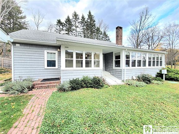 The home and garage have been updated with newer siding and insulation for enhanced efficiency. The first-floor primary bedroom is conveniently located near a full bathroom, while the main level features a large eat-in kitchen, an enclosed mudroom, a formal dining room, and an open living room with a cozy wood-burning fireplace. The finished basement includes an additional fireplace and newly installed Bilco doors for easy access and furnishing.
