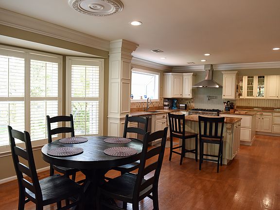 Gourmet kitchen with oversized island, stainless steel appliances, and breakfast nook overlooking the backyard