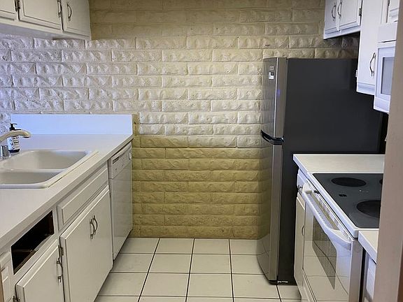 Full size updated kitchen with quartz countertop, stainless steel electric stove, stainless steel refrigerator, microwave, dishwasher, and garbage disposal and tile floors.