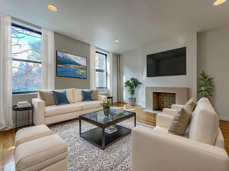 Spacious BR Renovated, Deco Fireplace Large, south facing one bedroom. Open kitchen with counter and pantry. Hardwood floors throughout. Excellent closet space. Recessed lighting and decorative fireplace. Great light. Large, windowed bathroom with linen closet has sandstone tiles and bathtub. Pets OK.