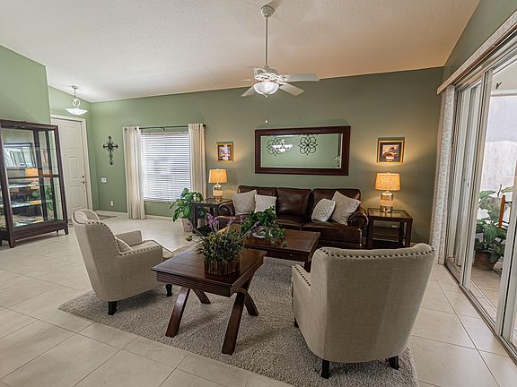 Beautiful 2/2/2 home located in the desirable Cascades community! This well-maintained residence features tile flooring in the main living areas and carpet in the bedrooms. Enjoy peace of mind with accordion hurricane shutters and stylish plantation shutters throughout. The home boasts cathedral ceilings, crown molding, and a spacious, enclosed/covered lanai--perfect for relaxing or entertaining.The gorgeous updated kitchen has granite counters, gas cooking, stainless appliances, water filter system. The updated guest bathroom adds a modern touch. Flexible living spaces with living, family and dining rooms. 2025 A/C & recently painted exterior. Prime cul-de-sac location. Active 55+ gated community with resort style amenities, pool, fitness center, pickleball courts, more!