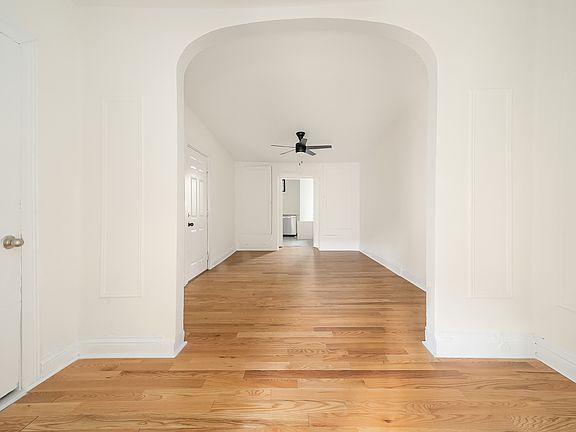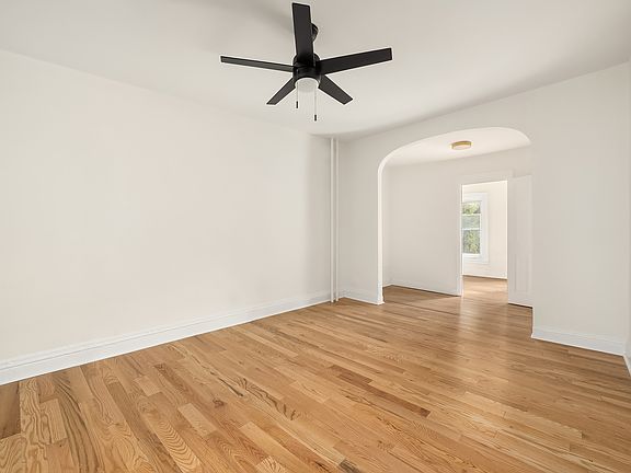The south-facing 16' wide, triple-window living room (or second bedroom) is awash in sunlight and accented by charismatic arches and frame moldings. The home office and 16' long formal dining room feature more divine decorative moldings, an arched doorway, and an efficient ceiling fan. The brand new eat-in kitchen is outfitted with stainless steel appliances, including a dishwasher and gas range, pristine, white quartz countertops, generous, wrap-around cabinetry, and custom lighting. Two windows provide ample ventilation and sunshine.