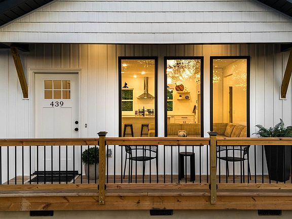 Front porchPerfect trim workSelected finishesRange hoodFloating wood shelvesPrivacy treesExtra storage area