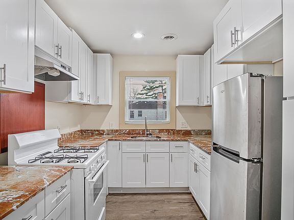 This two bedroom upper flat sits at 4392 Chatsworth in Detroit's Morningside neighborhood on the east side and offers a bright, comfortable space that is fully updated. Set within a classic colonial-style home, it carries the traditional lines and symmetry the area is known for. The kitchen features crisp whie shaker cabinets paired with striking polished stone countertops in a warm, dramatic marble pattern that adds depth and sophistication. Inside, you'll also find refinished wood floors, a modern bathroom with a tiled tub surround, and a practical, inviting layout with side access for easy entry and a shared basement for storage and laundry needs. A private outdoor terrace overlooks the back of the property, giving you a quiet spot to unwind. The location places you close to the buzz of East Warren's growing restaurant and retail corridor, with quick access to Grosse Pointe amenities, parks, and waterfront spots along Lake St. Clair.