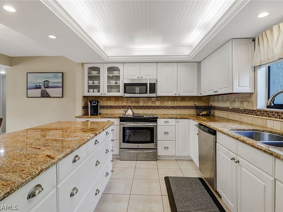 Lovely & tastefully decorated first floor 3/2 corner condo sold turnkey. Location is ideal and you will enjoy the park like setting with large trees and lush landscaping views for expansive lanai. Owners have taken great pride in ownership here. New flooring, totally renovated kitchen with island, granite counters, under the cabinet lighting, attractive backsplash,tray ceiling, stainless appliances and bead board accents. 2 panel doors, newer washer and dryer. Updated baths, vanities, sink, lighting and fixtures. Master suite offers 2 walk in closets. Owner has added new electric sunshades and a Murphy bed that is great for overflow and allows for that flex space that is so desirable. Two additional storage areas that will come in handy to store luggage, golf clubs, x-mas decorations. The gated community is located off the McGregor corridor and on the RIVER. the 192 wet slip marina and dry dock storage, 18 hole executive golf course, 13 har tru tennis ct, 8 pickle ball ct and 3 bocce courts, fitness center, lap pool and community pool literally steps from your front door & 2 restaurants. Live the dream today!
