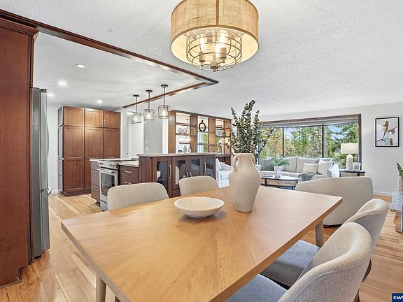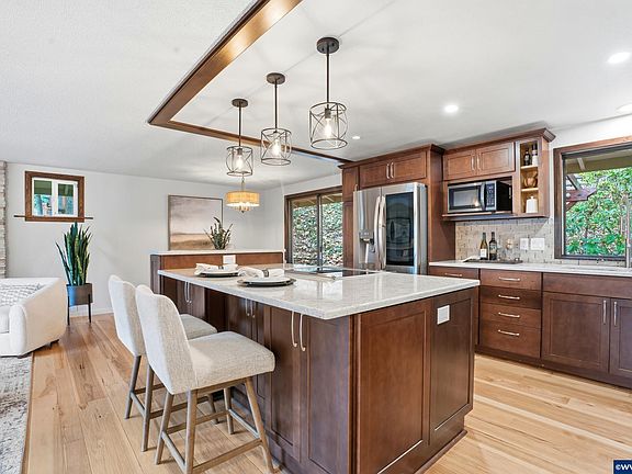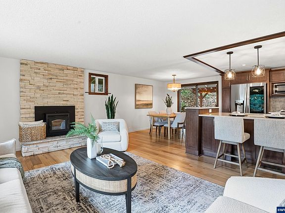 Turnkey living awaits in this Mid-century home nestled in the verdant hills of SE Eugene! The spacious Interior updates include an updated kitchen with high end appliances with soft close cabinets, newer water heater, pellet stove, floors and interior paint. Downstairs features separate family room and 4th bedroom. Exterior improvements include fencing, low maintenance landscaping, exterior stone work, and updated decking off the master and dining area. Backyard also features a covered deck.