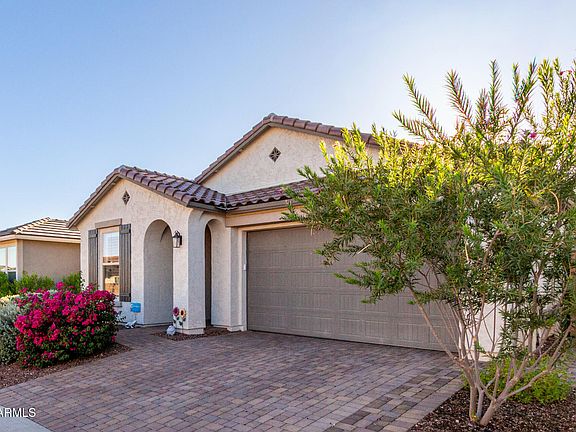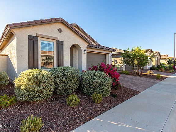 You'll LOVE this beautiful home with POOL in Discovery at Verrado! Its charm starts with a lovely mature landscape & a 3-car tandem garage w/paver driveway. The fabulous interior features plantation shutters, tons of natural light, neutral paint, recessed lights, and wood-look tile flooring t/out. The seamlessly flowing open layout is paired with multi-sliding doors to the back! The impressive kitchen boasts SS appliances, a walk-in pantry, quartz counters, herringbone tile backsplash, cabinets w/crown molding, and an island w/breakfast bar. For added versatility, you have a den just off the front entry. The main bedroom has an ensuite with dual sinks & a walk-in closet. Enjoy the backyard oasis with a covered patio, well-laid pavers, & a sparkling pool! Plus mountain views! Just WOW!