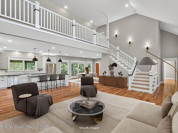 Discover a rare opportunity to own a brand-new luxury residence on 24.76 acres of complete privacy, surrounded by sweeping mountain views. Approached by a long, scenic driveway that sets the tone for this one-of-a-kind residence. Spanning an impressive 5,155 square feet, this home is a striking blend of modern design, spacious living, and the timeless beauty of the Catskills. Upon entering, you're greeted by the dramatic open-concept living space, where soaring ceilings and large windows frame the ever-changing mountain landscape. At the heart of the home is a custom chef's kitchen featuring rich black granite countertops, a generous center island, and seamless flow into the dining and living areas—perfect for effortless entertaining. A second-story deck extends off the dining room, inviting you to dine al fresco while overlooking the tranquil scenery. There are two bedrooms on the main floor, each with stunning ensuite baths creating a serene retreat for residents and guests. A powder room with laundry completes the first floor. Upstairs, the expansive primary suite offers a private sanctuary, complete with a spa-like ensuite bathroom, dual closets, and access to breathtaking views. The versatile loft offers flexibility for an additional living area, home office, or creative studio—all while enjoying mountain vistas through thoughtfully placed oversized windows. The finished walk-out basement expands the living space even further, featuring a full kitchenette, a spacious media room, a bedroom, and a full bath—perfect as a guest suite or entertainment hub. With nearly 25 acres, the property invites exploration, relaxation, and connection with nature. Open expanses and wooded areas provide the perfect canvas for outdoor living, whether that's creating gardens, meandering trails, adding a pool, pond, or simply enjoying the peace and quiet of the Catskill Mountains. Designed for those who crave both privacy and sophistication, it's a place where you can gather family and friends, create generational memories, and immerse yourself in the beauty of the mountains. Here, modern luxury finds its perfect setting in the timeless landscape of the Catskills.