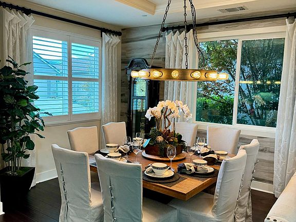 - Large 8-person dining table and custom cove ceiling in dining room