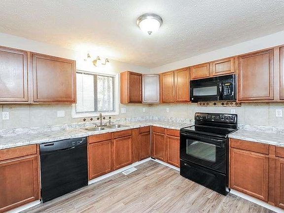 Cozy stone fireplaceNewer back deckBlack appliancesSpacious kitchenLaminate flooringStained cabinets