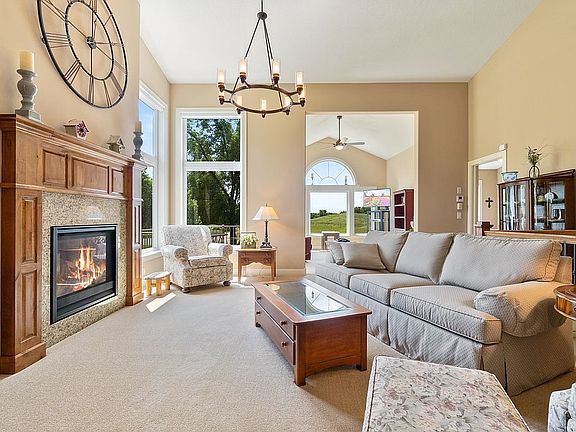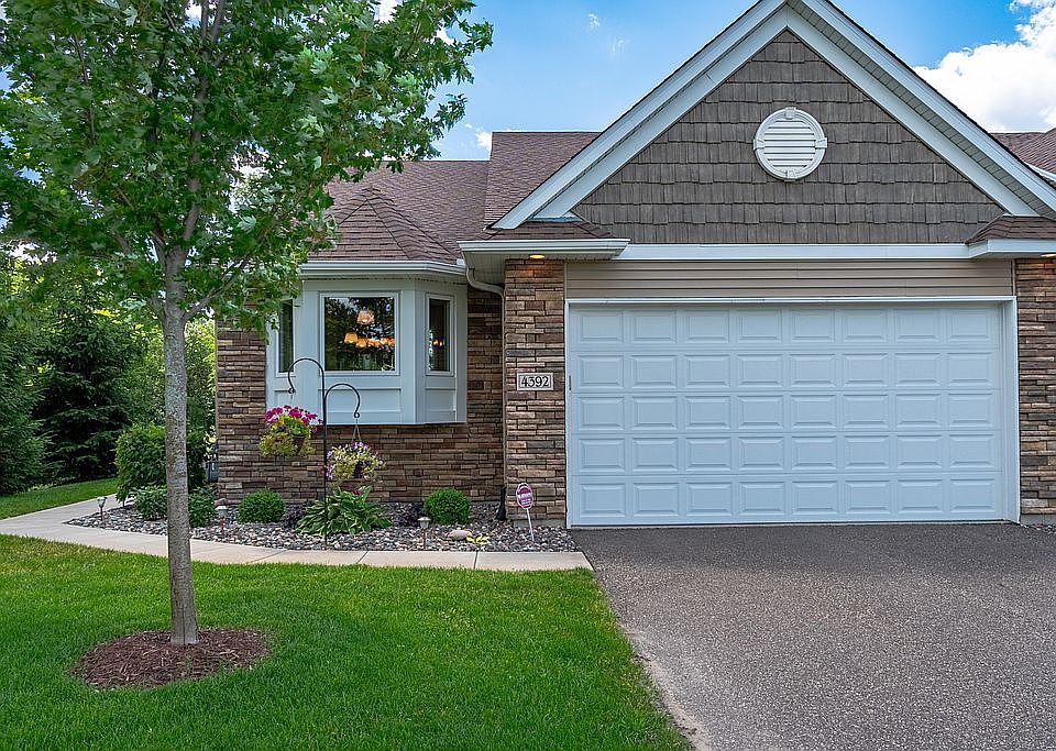 Located on the former Kate Haven Golf Course in Blaine, this 2 bedroom plus office executive townhome is an actual end unit with an expansive open space & mature evergreen trees providing more privacy than the standard townhouse lot. A perfect upgrade for empty nesters looking to retire from mowing & shoveling. There is an abundance of natural light in the bright and spacious main level provided from vaulted ceilings and large windows. Premier lighting throughout makes this townhome unique. From the large deck see views of Rice Creek Regional Park, with trail access for biking and walking right across the street. Kitchen features include real wood floors, alder wood cabinets, roll-out shelving, soft close drawers, stainless steel appliances with gas range. Granite countertops throughout the home. The finished lower level features stone gas fireplace with large walk out covered patio. Second bedroom includes walk-in closet. Full bath. Office/den with sliding glass doors and walk-in closet. Upgrades include extended kitchen cabinets with beverage cooler & library space for your cookbook collection; lower level full bar with refrigerator and sink; garage floor coating by Great Garage Floors; storm doors & gutters; Hunter Douglas window treatments; security system by WH Security. Make this your best move.