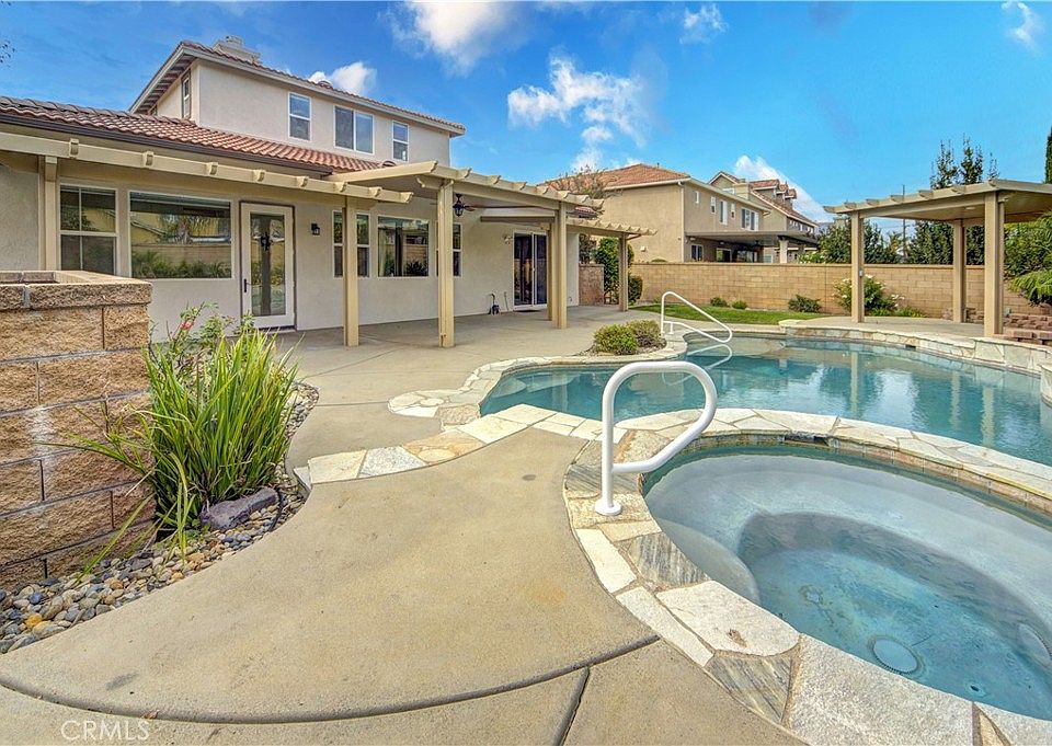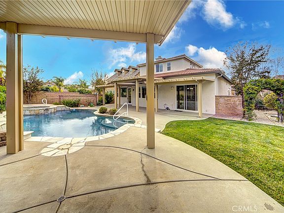 Located in highly sought-after South Temecula, this elegant home offers three private bedroom suites and a versatile floor plan perfect for multi-generational living. The formal Rotunda entry way features high ceilings and is complimented by a tile medallion. The main level features a spacious family room and kitchen great room combo that opens to a full-length Alumawood patio overlooking a lush yard and sparkling pool and spa with newer equipment. The kitchen has plenty of cabinet space, newer stainless steel appliances with an island and breakfast area. Enjoy a formal dining room with double French doors opening to a secluded garden seating area in the rose garden. The master bedroom and an additional private suite, with it's own separate sitting area, are located downstairs on opposite sides of the home. The Master suite includes French doors to the patio, dual closets, walk-in shower, walk-in tub, dual vanities, and an upgraded toilet/bidet combo. The second downstairs suite with its own private sitting area provides ideal guest or in-law accommodations, or could be used as an office or den. Upstairs is a huge private suite which offers beautiful views. There is also a covered pavilion and a grass area, fruit trees in side yard. Additional features include a newer HVAC systems, guest powder room, laundry room with ample storage, and a security system with multiple Ring cameras. This home combines comfort, privacy, and resort-style living in one of Temecula’s most desirable neighborhoods, within the Great Oak High School area, and is close to shopping, wineries and restaurants. The home is located on a cul-de-sac and across the road from a small park.