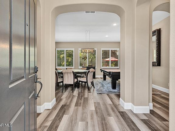 BEAUTIFULLY Upgraded Villa Serrano POOL Home! Gorgeous tropical landscaping beckons you towards the GATED front courtyard which offers PRIVACY and glides you into the entry of the home. Inside, you greet the BRAND-NEW wood-like plank vinyl flooring and BRIGHT home to discover. Spacious Living Room offers TALL windows with plantation shutters and offers dining area. The Kitchen showcases a HUGE solid-wood center island with sink, Corian countertops, glass-tile backsplashes, WALK-IN pantry, Kitchen eating area ROTUNDA, wine refrigerator, and BRAND-NEW Café stainless-steel appliances. Neighboring Family Room boasts CUSTOM built-ins, large gas fireplace with running hearth, built-in speakers, windows with plantation shutters, and windowed door to backyard. The Master Suite is BIG and features plank vinyl flooring, windows & windowed door to backyard with plantation shutters, and large en-suite Master Bathroom which highlights his & hers tile-topped vanities, large soaking tub, large tile shower with shower bench, separate water closet, and an amazing WALK-IN closet with custom built-ins. Hallway leading to the secondary bedrooms is complete with a LONG built-in desk and half-bathroom with modern/upgraded vanity. 4 Secondary Bedrooms all offer plank vinyl flooring, BRAND NEW ceiling fans, large windows, ample closet space, and utilize a full bathroom which highlights a tile-topped dual sink vanity and separate water room with tile-walled tub shower. The private Backyard boasts a FANTASTIC POOL with raised spa, tropical landscaping, and barbecue area with stacked-stone surfacing & Turbo Elite stainless-steel barbecue. Custom painted garage with EPOXY painted floor, a PURCHASED Solar System, a BRAND-NEW ADT Security System, and a BRAND-NEW Heat/AC system complete this amazing home. GO VIEW THIS WONDERFUL HOME TODAY!