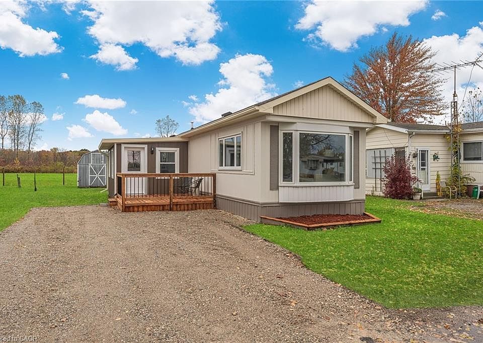 Welcome to Ellsworth Acres Mobile Home Community in Wainfleet! This beautifully updated mobile home has been extensively renovated and is move-in ready. The spacious, modern kitchen boasts stainless steel appliances (stainless stove to be installed), stylish flooring, new drywall with vapor barrier, and sleek pot lighting. The open-concept kitchen, living, and dining area is bright and inviting, featuring large vinyl/thermal windows and a charming coffee bar. The home includes two bedrooms plus a generous office—perfect for hosting guests or working from home. The fully updated bathroom features a brand-new walk-in shower, ideal for those with mobility needs. Additional improvements include new PEX water lines, doors, trim, and a brand-new deck for outdoor enjoyment. With parking for two vehicles and a 10' x 10' storage shed, this move-in-ready home checks all the boxes. Monthly fees cover land lease, property taxes, garbage and snow removal, water, and septic services. Ideally situated just a short drive from Dunnville, Welland, and Smithville, this home offers the perfect blend of modern comfort and small-town charm. Note: Some photos have been virtually staged.
