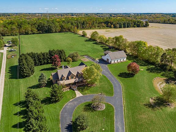 Rustic charm with custom finishes and upgraded amenities! Mini-Farm perfect for horses, livestock or large TOYS! BARN w/ propane heated workshop, 4-6 stalls, equipment barn & loft. 7 acre pasture, 2+ acres mowed. Home has log cabin feel w/ Hickory flooring, doors, woodwork & cabinets. Kitchen w/double ovens, solid surface counter. 1st fl Owners Suite, w/ walk in shower dual sinks, 1 fl Office / Flex Rm can be used as 4th Bedroom. 1st fl utility room w/ cabinets & tub. Two story Great Room has wall of River Rock w/pellet stove. Finished LL with Rec Rm & workout space. 2nd fl has two nice dormer Bedrooms and full Bath. Updates include new carpet, Geothermal HVAC 2017, Water treatment system 2017, exterior & interior paint.Large 3 car side load Garage & stamped patio.