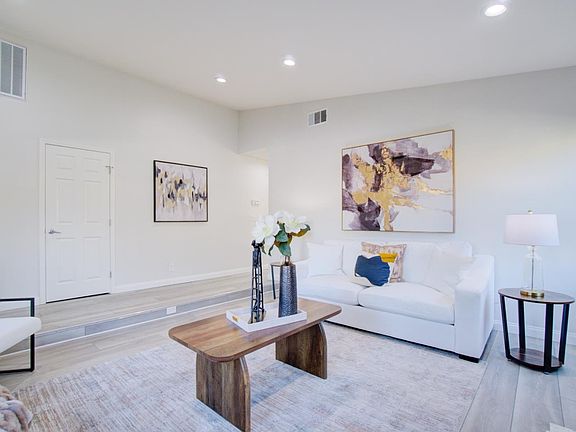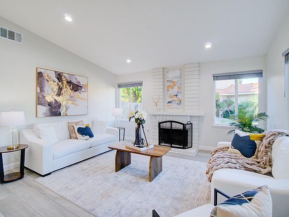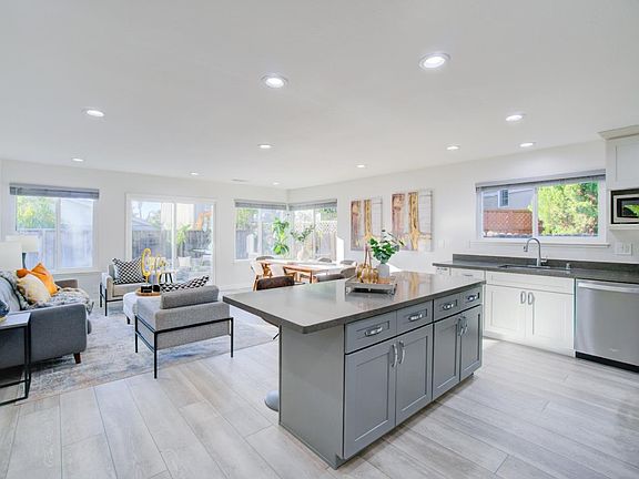 Welcome to 4399 Pitch Pine Court a 4-bedroom 2-bath Contemporary Ranch tucked into a quiet cul-de-sac in the Blossom Valley neighborhood of South San Jose. A brick walkway and freshly mulched front landscaping create inviting curb appeal. Inside, wide plank laminate flooring, vaulted ceilings, dual-pane windows, and an open layout reflect a modern Mid-Century aesthetic with natural flow between social and private areas. The step-down living room with fireplace connects seamlessly to an open-concept kitchen and casual dining area. The kitchen features Quartz countertops, custom Shaker Style soft-close cabinetry in a two-tone palette, and a contrasting island with seating, while solar panels enhance the homes modern efficiency. Sliding doors open to a spacious backyard with a large patio, vibrant lawn with automatic sprinklers, and a mulched garden border. The bedroom wing includes a primary suite with ensuite bath, plus three additional bedrooms, one of which features double doors offering flexibility of use, and a hall bath. The finished oversized two-car garage includes epoxy flooring and laundry hookups. Conveniently located near Santa Teresa County Park, Westfield Oakridge, and commuter routes 85 and 101.