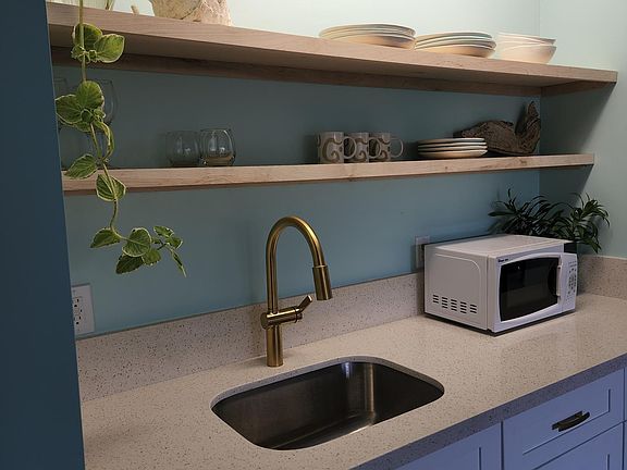 kitchenette w/ full fridge and freezer, hot plate, microwave, toaster oven, and more