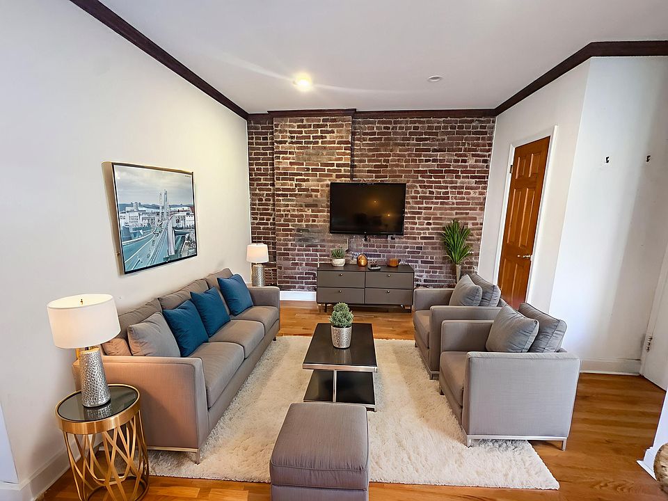 Exposed brick wallBathroom with bath tubCrown moldingBreakfast barHardwood floorsLarge windowsRenovated kitchen