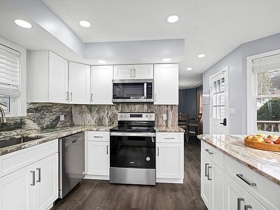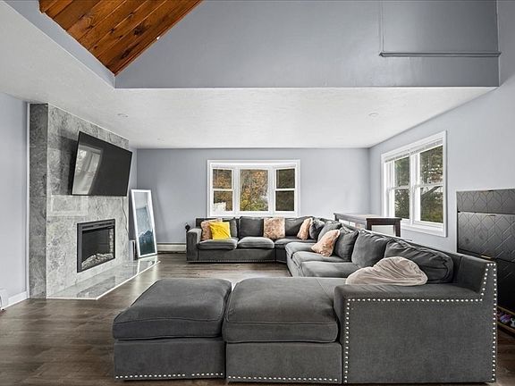 Step through the elegant front door into a striking entryway with a wood-vaulted ceiling and balcony overlooking the main floor. The large living room features a beautiful fireplace, perfect for cozy evenings. The dining room shines with a chandelier, and the kitchen offers quartz counters, French doors to the deck, and plenty of space to cook and gather. A convenient half bath completes the main level. Upstairs, you’ll find a full bath , a vaulted-ceiling main bedroom, and a bedroom. A third level adds two large bedrooms with custom windows, big closets, and sweeping views for miles.Located just minutes from Route 20 and the Mass Pike, this home offers easy access for commuters while maintaining peace and quiet at home.