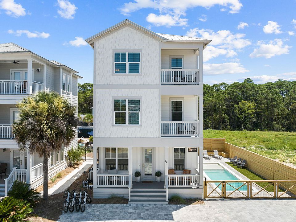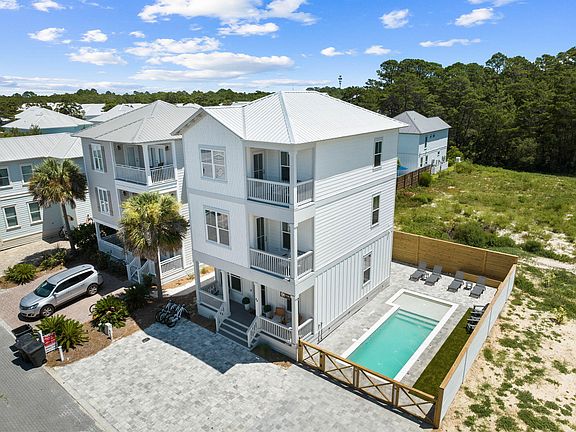 Discover the epitome of coastal elegance at 44 Abbey Rd, a 4-bedroom, 3.5-bath home that exemplifies refined living in a coveted location. Nestled just steps away from 30A and the Emerald Coast, this exceptional property combines timeless design with modern convenience.As you step inside, the open living, kitchen, and dining area welcomes you with a seamless flow and an abundance of natural light. The kitchen, adorned with sleek stainless steel appliances, reflects a perfect balance of style and functionality, making it a chef's dream. This three-story home ensures both privacy and togetherness. The second floor hosts two spacious bedrooms with a Jack and Jill bath, offering comfort for guests or family members. On the third floor, there is a large bedroom with two queen sized beds and a private en-suite bath. The light filled Primary Suite offers peek-a-boo views of the gulf from both the bedroom and a private balcony. This suite is a sanctuary for relaxation and rejuvenation.