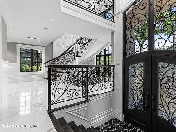 Introducing 44 Annfield Court, the crown jewel of Staten Island's most coveted enclave, Todt Hill. This architectural masterpiece redefines luxury living, blending timeless elegance with modern sophistication across every meticulously designed detail. From the moment you step into the grand foyer, soaring ceilings and walls of glass flood the home with natural light, setting the stage for an unparalleled living experience. The expansive great room is both breathtaking and inviting, showcasing intricate coffered ceilings, dramatic floor-to-ceiling windows, and elegant French doors that open to a private terrace. A custom fireplace anchors the space, creating the perfect atmosphere for both grand entertaining and intimate gatherings. Every finish in this residence speaks to refinement. Exquisite Versace tile flooring infuses the interiors with a touch of glamour, while the chef's dream kitchen is outfitted with professional-grade Sub-Zero and Wolf appliances, honed marble countertops, and abundant custom cabinetry. An adjacent dining area provides a sophisticated setting for unforgettable dinner parties. The primary suite is a sanctuary of indulgence, boasting a palatial walk-in closet and a spa-inspired bath complete with a custom vanity television mirror, soaking tub, and glass-enclosed steam shower with rain feature. Two additional generously proportioned bedrooms and a full bath provide the utmost comfort for family and guests. The fully finished lower level is an entertainer's paradise. Here, a custom wet bar complements a spectacular, climate-controlled wine room designed to house 1,100 bottles at optimal conditions—ideal for connoisseurs and collectors alike. This residence is also a true smart home, fully integrated with Lutron automated lighting and a Crestron home automation system that seamlessly controls lighting, climate, entertainment, and security at the touch of a button. Outdoors, the estate is just as impressive. Lush landscaping frames an expansive patio with a fully equipped outdoor kitchen, pizza oven, and heated spa. A brand-new Techo-Bloc Mika HD pavered driveway with a snowmelt system, along with heated front steps, ensures effortless year-round luxury and convenience. With over 12,000 square feet of property, there is ample room to design and build a pool to suit your vision of outdoor living. Practicality meets indulgence with a spacious garage featuring a car lift for multiple vehicles, while advanced climate systems ensure comfort throughout the seasons: a linear diffusion central A/C system for seamless cooling and multi-zone radiant heat for cozy winters. Every element of 44 Annfield Court has been carefully curated with no expense spared, resulting in a home that is at once innovative, opulent, and timeless. More than a residence, it is an experience-rare opportunity to own a true statement of luxury in one of Staten Island's most distinguished neighborhoods.
