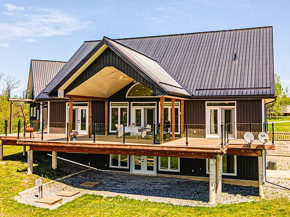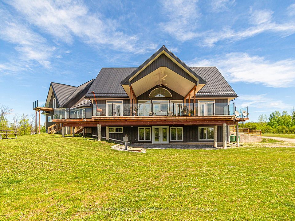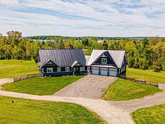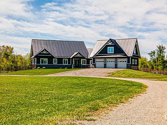 This beautiful 3-bedroom, 3-bathroom custom-built home is set on a private 7.4-acre lot and offers exceptional space and craftsmanship throughout. Featuring 9-ft ceilings and 8-ft glass doors, the home is finished with 8-inch engineered hardwood flooring. The spacious living room boasts 16-ft cathedral ceilings, pot lights, ceiling fans, and 7-ft windows that flood the space with natural light and provide a seamless walkout to an approx. 800 sq ft deck with custom aluminum frameless glass railing perfect for alfresco dining and entertaining. Enjoy five walkouts to the main deck, ideal for seamless indoor-outdoor living. The gourmet kitchen is a showstopper, featuring maple cabinetry with solid oak doors, a distressed leather granite countertop, and a massive 5x10 center island. The primary bedroom includes a walk-in closet, walkout to the deck, and an opulent 5-piece ensuite. The 2,525 sq. ft. basement offers three additional walkouts and endless potential. Additional highlights include upper and lower garages, perfect for vehicles, tools, or extra storage. Located just 10-15 minutes from shops, a bakery, pharmacy, and restaurants, with easy access to parks, a library, medical services, and only a 5-minute walk to year-round recreation on Lake Scugog, including a nearby boat launch for convenient lake access.