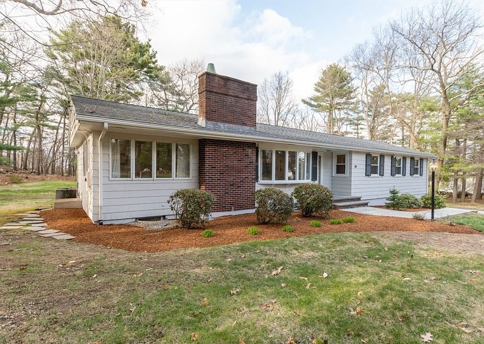 This lovingly maintained 3-bedroom, 2-bath ranch offers the perfect blend of charm, comfort, and location. Nestled on nearly an acre on Blue Hill Drive - a quiet, dead-end street—this home is ready for its next chapter. Step inside to find bright, airy rooms filled with natural light. The convenient layout features a spacious living room with a fireplace that flows seamlessly into the dining room, perfect for entertaining or relaxing evenings at home. The open eat-in kitchen leads to a covered porch and a beautiful backyard with a patio—great for outdoor gatherings, play, or future expansion. Other highlights include a large primary bedroom, a versatile finished basement with a fireplace, central air conditioning, and a large two-car garage. All this in the desirable Downey School district, with quick access to the commuter rail, Route. 128/I-95, Legacy Place, and University Station. This is the kind of neighborhood where people put down roots. Don’t miss this opportunity.
